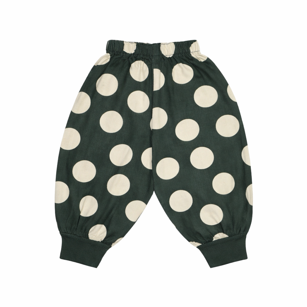 Claude & Co's cuffed balloon leg trousers in a bold kale and mint green polka dot. Crafted from 100% GOTS Certified Organic Cotton twill, these unisex trousers feature elasticated cuffs for comfortable, easy wearing with the oversized balloon silhouette. The hidden waistband adjustment ensures a perfect fit that lasts longer.