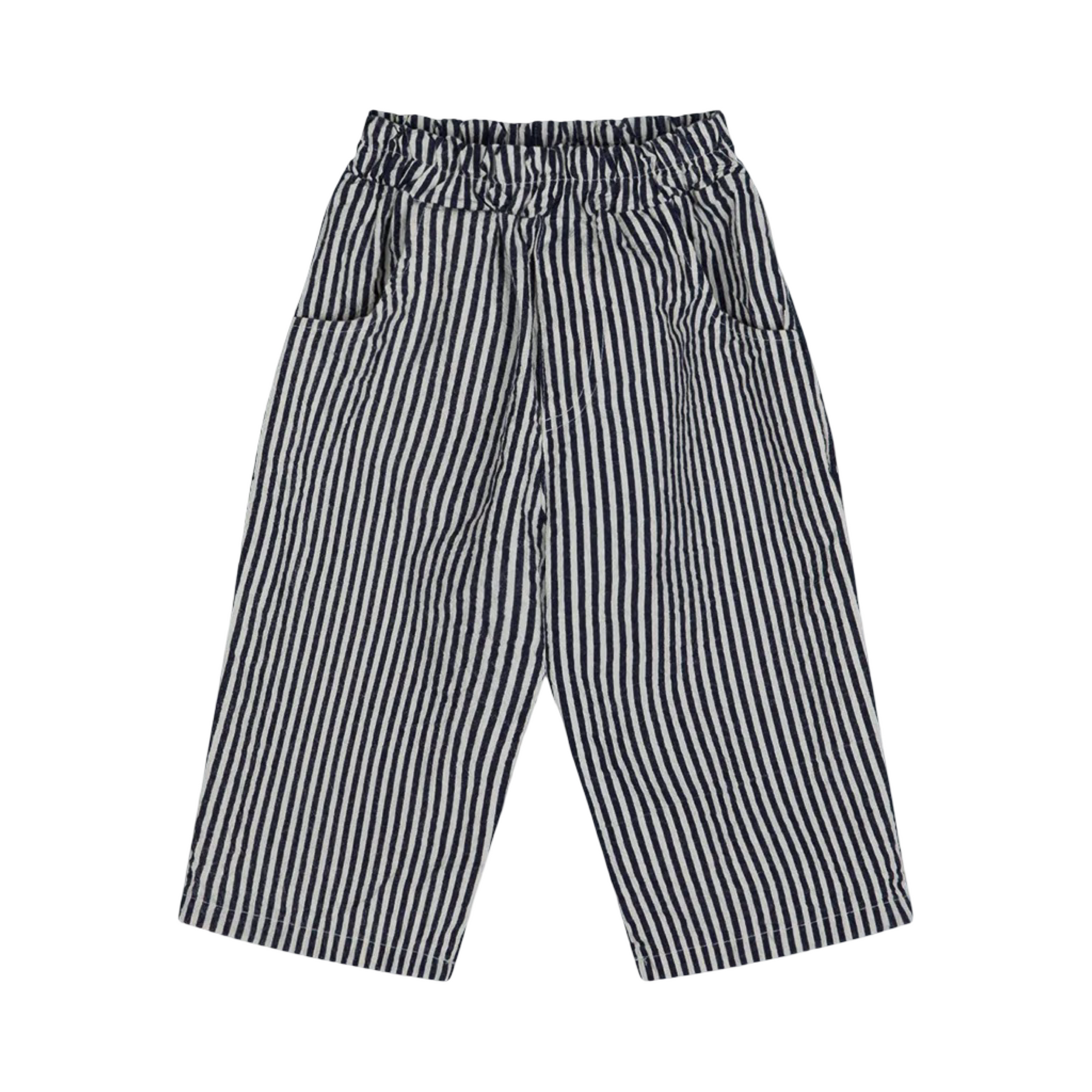 A loose leg cotton kids pants with a soft elastic waist, hand pockets and slight drop crotch for a unrestrictive fit. Designed to sit at the ankles, roll the cuff for a cropped look