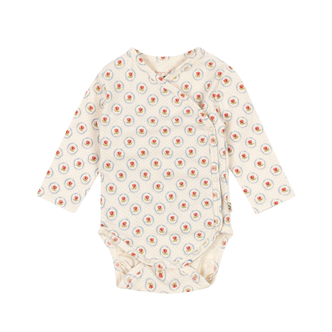 Konges Sløjd Wrap Body Mirage. Wrap your little one in cloud-soft comfort with this charming Konges Sløjd body. Crafted from organic cotton with just a whisper of stretch, it moves with your baby for all-day coziness. The clever snap buttons running down the sides and crotch mean quick changes without the fuss—because who has time for complicated dressing? The Mirage design adds a touch of whimsy to everyday wear. Perfect for layering or wearing solo, this wrap body is a wardrobe essential that keeps both baby and parent happy.